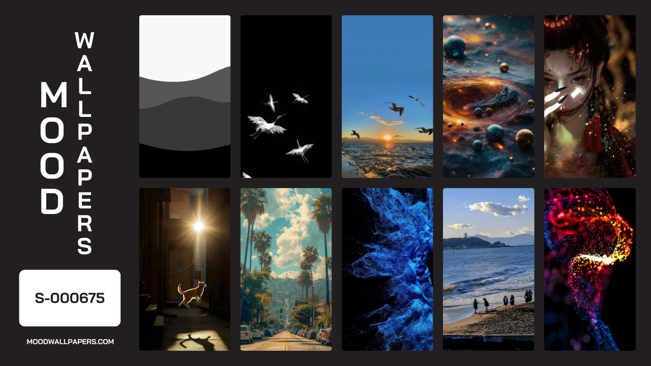Explore a collection of artistic and evocative imagery. Featuring intense character portraits with intricate face paint, elegant silhouettes of birds mid-flight, swirling blue abstract forms, a mysterious cat silhouette outlined by light, and a figure dramatically dissolving into fragments. Complemented by beautiful sunset seascapes, minimalist wave designs, sunny palm tree vistas, and abstract spheres.